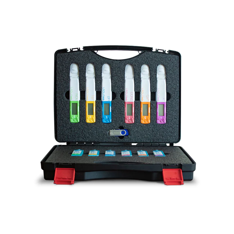 incluye los 6 parámetros de medición para el monitoreo agrícola, NO-3, K, Na, Ca, pH y EC. Un laboratorio portátil, ideal para monitorear el análisis de savia, solución nutritiva, solución del suelo, agua para riego, etc. También se utiliza en aplicaciones como alimentos, industrial, acuacultura, etc.